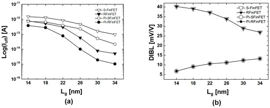 (a) Ioff (VGS = −0.5 V, VDS = 1.5 V) and (b) DIBL (VDS.low = 0.05 V, VDS.high = 1.5 V) dependence on Lg of conventional S-FinFETs and Pi-FinFETs.
