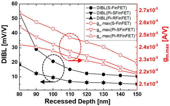 Figure 6 also shows the DIBL and gm.max characteristics of Pi-FinFETs and S-FinFETs according to the recessed depth. As shown in Figure 6, as the recessed depth decreases, DIBL characteristics of S-FinFETs increases sharply, whereas the DIBL of Pi-FinFETs is relatively constant because the PDW of Pi-FinFETs is wider. As the recessed depth decreases, the gm.max, which represents the on-current characteristic, is improved. In other words, Pi-FinFETs have found that the recessed depth can be set more flexibly than conventional S-FinFETs.