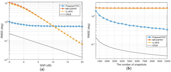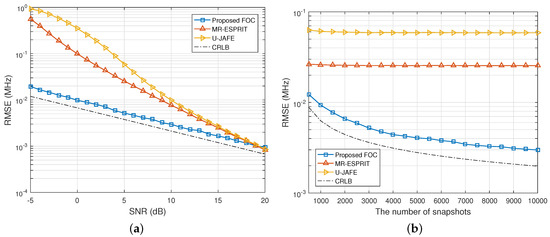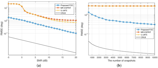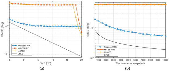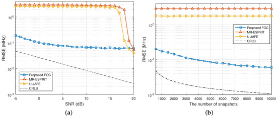 Next, we examined the estimation performance of the proposed FOC-based estimator in the presence of multipath propagation. Assume that one group of coherent signals from arrives at a six-element array; the corresponding frequency offsets for the signals are 1.2 MHz, 1.6 MHz and 1.8 MHz, respectively. The fading amplitudes of the coherent signals were , while the fading phases were , respectively. The temporal and spatial smoothing factors were and , respectively. Figure 6 shows the RMSE of DOA estimates in the overdetermined case. It can be found that as the SNR and the number of snapshots increased, the RMSE of DOA estimation decreased gradually for all of the methods, where the accuracy of our algorithm improved asymptotically, whereas the RMSEs of U-JAFE and MR-ESPRIT were close to each other at low and moderate SNRs and tended to saturate at and , respectively. Evidently, the proposed FOC-based estimator was significantly superior to the counterparts for all SNRs and snapshot sizes tested, mainly because it exploited the dual rotational invariance of the frequency constructed by the rotation-invariant property in the generalized array manifold.