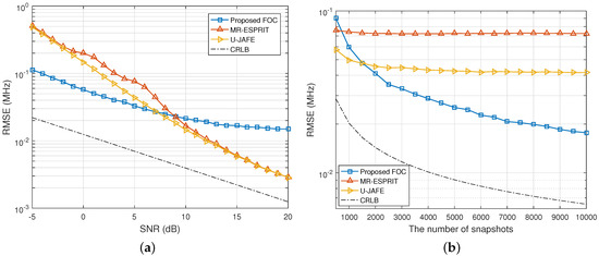 Figure 4 exhibits the performance of the three methods for the frequency estimation, as well as CRLB as a function of SNR and the total number of snapshots. One can observe that generally, the proposed method was distinctly better than the other two algorithms except at 20 dB and above, and U-JAFE outperformed MR-ESPRIT for all SNRs and snapshot sizes, which agrees with the results in Figure 2.