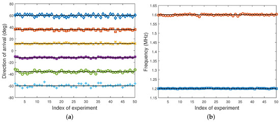 Estimation results of groups of coherent signals via 50 runs in the underdetermined case. (a) DOA and (b) frequency versus the index of experiment when dB and .