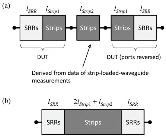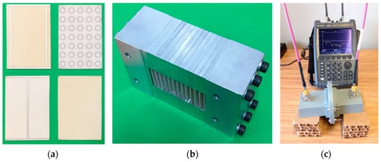 The metamaterials described in Section 5.1 were fabricated using a multilayer PCB fabrication process on Rogers 4000 series substrates of which individual PCBs were mounted longitudinally in waveguide test fixtures. The PCB thickness was 0.5 mm. The PCBs were 25 mm × 36 mm and each type required to construct the MNG (SRR) and ENG (strip) regions is shown in Figure 8a. The rings of the SRRs use the middle metal layers but are visible through the translucent substrate, whilst the strips are placed on the top metal layer; the bottom metal layer is unutilized. The DUT is 50 mm long (lSRR = 25 mm and lStrip1 = 25 mm). The length of the strip loaded waveguide is 25 mm.