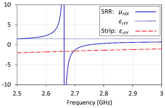 Theoretical models for the SRR and strip loaded waveguides are described in earlier work [] and are used to predict the μXX and εYY of the SRR loaded waveguide, and εYY of the strip loaded waveguide. These models include electric polarization of the SRRs and dielectric loading due to the PCB substrates, and use the continuous medium approximation. The other tensor permeability and permittivity diagonal elements are equal to that of free-space, and the off-diagonal elements are zero. Figure 5 shows the frequency response of μXX and εYY of the SRR loaded waveguide, and εYY of the strip loaded waveguide over the frequency range 2.5 GHz to 3 GHz. It is apparent that SRR loading provides negative permeability over a narrow band (2.663 GHz to 2.752 GHz) and its value is strongly dependent on frequency. On the other hand, strip loading provides negative permittivity over a much wider frequency range and is a relatively weaker function of frequency.