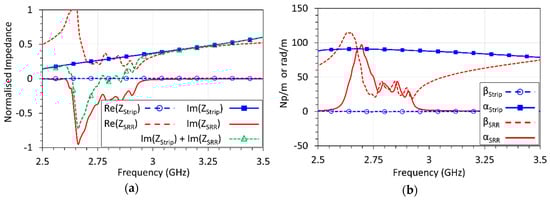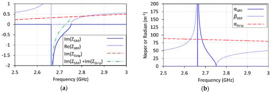 Figure 9 shows that the strip loaded waveguide behaves like an ideal evanescent-mode attenuator with an essentially zero phase constant (β) and pure imaginary characteristic impedance over the entire frequency range of interest. The SRR loaded waveguide has almost pure-real wave-impedance and near-zero attenuation constant (α), when operating below about 2.6 GHz and above about 2.95 GHz, and it therefore operates in a propagating mode in these frequency bands. On the other hand, between about 2.65 GHz and 2.95 GHz, it behaves as a lossy evanescent-mode attenuator with complex valued propagation constant and wave-impedance. This lossy behavior is attributed to losses in the SRRs which are operating near resonance [].