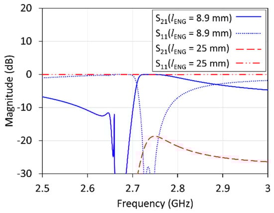 Figure 11 shows the S-parameters of the cascaded structure of Figure 3a when lStrip2 is equal to −40.8 mm. For reference, the S-parameters of the DUT are shown. At 2.8 GHz, the tunneling effect is clearly revealed with an 8.6 dB boost in transmission (S21) compared to the DUT on its own, as well as in improvement of input and output match. Importantly, the resulting S-parameters are symmetric (S11 = S22).