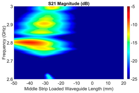 The tunnel identification method described in Section 4 was applied to the DUT measurements. Figure 10 shows the transmission (S21) as a function of frequency (f) and middle strip loaded waveguide section length (lStrip2). Transmission is maximum at 2.8 GHz, and peaks when lStrip2 is −40.8 mm. The lStrip2 value of −40.8 mm means that the total length of the equivalent strip loaded section of Figure 3b, , is 9.2 mm. This value is comparable to the theoretical prediction of 17.8 mm given in Section 5.
