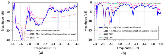 S-parameter magnitude frequency responses after tunnel identification and after loss is removed: (a) S21, and (b) S11 (and S22). The DUT response is included for comparison. (In color.).