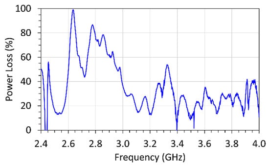 where S11, S22, S12 and S21 are the S-parameters of the two-port. Figure 12 shows the power loss of the DUT after tunnel identification. Significant loss occurs within the MNG band and this explains the insertion loss of 8.1 dB at 2.8 GHz after the tunnel identification process of Section 3. The effects of losses can be removed from the symmetric two-port by scaling the S-parameters by . With the effects of losses are removed (pink dashed trace in Figure 11), the resulting tunnel residual insertion loss, due to mismatch, is 2.2 dB.