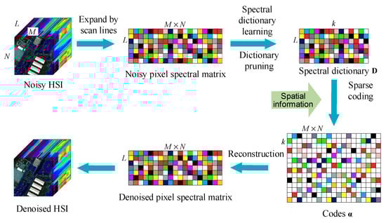 Therefore, we expand the noisy HSI by scan lines into a pixel matrix, which is used as a training set so that a spectral dictionary can be obtained. The noisy image can be reconstructed with the dictionary and the corresponding sparse codes. The denoising process is shown in