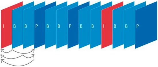 Typical sequence with I, B and P frames. P frame can only refer to the previous I or P frames, while a B frame can refer to previous or subsequent I or P frames.