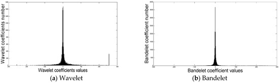 Histograms of bandelet vs. wavelet coefficients. Bandelet transform contains only the most significant coefficients and, therefore, those which carry information.