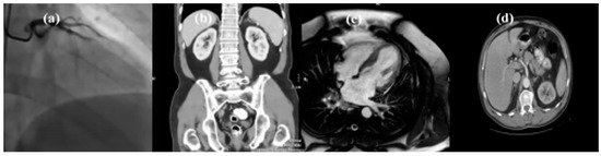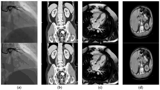 The images shown in Figure 10 are a simple illustration and their technical and medical characteristics are summarized in Table 1 (see also Figure 6). They represent: (a) Coronary angiography-X-ray; (b) abdomen/pelvis-computed tomography (CT); (c) heart-axial MRI; (d) bladder-MRI.