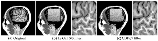 It is well known that lossless compression methods have the advantage of providing an image without any loss of quality and the disadvantage of compressing weakly. Hence, this type of compression is not suitable for transmission or storage of big data such as video. Conversely, lossy compression produces significantly smaller file sizes often at the expense of image quality. However, lossy coding based on transforms has gained great importance when several applications have appeared. In particular, lossy coding represents an acceptable option for coding medical images. e.g., a DICOM (Digital Imaging Communication in Medicine) JPEG (Joint Photographic Experts Group) based on discrete cosine transform (DCT) and a DICOM JPEG 2000 based on wavelet. In this context, wavelet-based image coding, e.g., JPEG2000, using multiresolution analysis [3,4] exhibits performance that is highly superior to other methods such as those based on DCT, e.g., JPEG.
