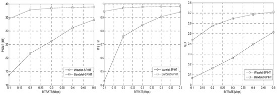 As illustrated in Figure 11, the proposed method demonstrates a relatively better performance compared to the standard video coding AVC and HEVC in terms of PSNR. For example, for a bit rate greater than 1.3 Mbps, it is clear that in terms of PSNR, the performance of the proposed algorithm (bandelet-SPIHT) is lower than that of HEVC but almost always higher than that of AVC. And for low bit rates, our encoder outperforms video coding standards. For example, for 0.6 Mbps, our method exceeds AVC and HEVC by 3 dB and 0.5 dB respectively.