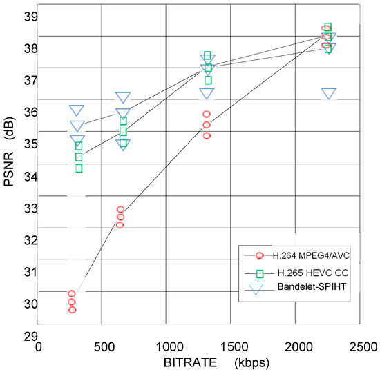 Figure 11 shows the performance, in terms of PSNR vs bitrate, of three compression techniques H264/AVC, H265/HEVC and bandelet-SPIHT. Each value represents an average within its confidence interval. For example, for 270 kbps, the PSNR obtained by bandelet-SPIHT is higher than that produced by the other methods and its confidence interval is tightened around the mean value. On the other hand, for 2260 kbps, the PSNR obtained by bandelet-SPIHT is lower than that produced by HEVC. In addition, its confidence interval is asymmetric with a greater tendency towards lower values. Consequently, we will have little confidence in this average value obtained by the algorithm proposed for high data rates.