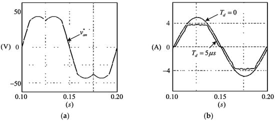 Effects of the dead-time in Figure 1a ( = 20 kHz, = 100 V, = 0.01 mH, = 10 Ω); (a) an a-phase pole voltage reference as space vector PWM (SVPWM); (b) comparing dead-time effects with equal voltage reference with (a).