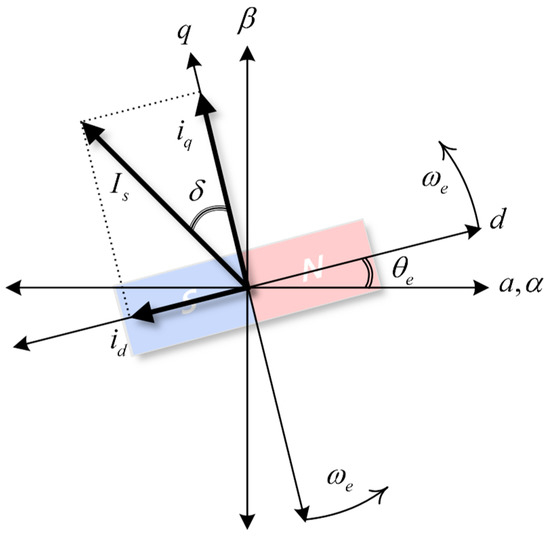 While the influence of the dead-time appears th harmonics in the synchronous reference frame as Equation (4), the TCV errors can be obtained through them [16]. Although the th harmonics appear on both d-q axis, the TCV error extracting axis can be selected as a d-axis since the d-axis has a larger voltage error than the q-axis. However, if there is a d-axis current (), the fundamental component of the harmonic voltages is moving to the q-axis as shown in Equation (4). Thus, to obtain a constant error regardless of the amount of d-axis current, the synchronous reference frame transformation based the three-phase current vector should be carried out. In this case, if the phase of the three-phase current vector is simply obtained by using the Equations (21) and (22), the harmonic components do not appear in the d-axis current because the harmonic component of the current affects . For this reason, the ideal phase of three-phase current vector can be obained by d-q axis current commands , as following Equations (27) and (28), assuming that the actual currents do not deviate for the current commands.