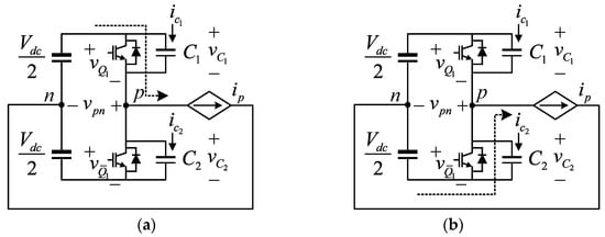 In Figure 5a, the dc-link voltage is charging to the capacitor while the upper switch is turning on. At that moment, the discharging current flows to the node ‘p’ due to the potential difference and is charging the capacitor of the lower switch so that the voltage of the lower switch parasitic capacitor is rapidly charged to . Consequently, when the upper switch is turning on, the output pole voltage of the half-bridge is hardly affected. On the contrary, when the both upper and lower switches are turned off (during the dead-time), as shown in Figure 5b, the capacitor of the lower switch is discharged and the voltage of arrives at zero. At this time, the current can be expressed by the sum of the charging current of the upper output capacitor and the discharging current of the lower output capacitor.