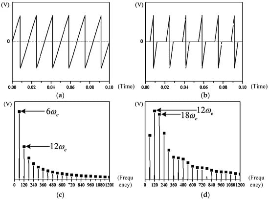 Figure 13 indicates the fast Fourier transform (FFT) results for two types of the DTCV errors. Figure 13a shows the voltage waveform of the amplitude error. Additionally, the FFT result of the error has a prominent component in the 6th harmonic as seen in Figure 13b. Figure 13c shows the voltage waveform of the slopes error of TCV. In addition, the FFT result of the slopes error has noticeable elements in the 12th and 18th harmonics, as seen in Figure 13d.