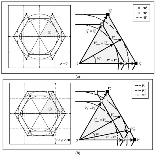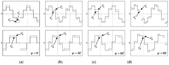 When the output voltage is in phase with phase current, the voltage distortion exactly coincides with the six active voltage vectors as in Figure 16a. Hence, by using the above Equations (31) to (39), the arbitrary voltage reference in the sector ① can be expressed as follows using the neighboring real voltage vectors ,.