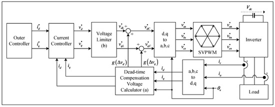 Especially, as shown in Figure 1a, a circuit structure such as a typical three-phase VSI in which three legs share a DC-link must ensure reliability of the system by applying dead-time. Figure 1b shows the operation of a single leg over time during one switching period. are ideal complementary switches on/off signals, are real switch on/off signals adapted to the dead-time and the subscripts indicate each phase. For example, are a-, b- and c-phase current and are phase resistor, inductor and voltage source, respectively. Since the dead-time cannot control actively, it causes not only serious voltage distortions in inverter output voltage as shown Figure 1b, but also adverse effects on the all algorithms using a voltage reference [3,4]. Figure 2a shows a pole voltage reference of a-phase in the three-phase VSI and (Figure 2b) shows current waveforms applied the dead-time to compare the ideal current waveform. Here, in the current waveform to which the dead time is applied, it can be seen that serious current distortion occurs near the zero point and near the peak area. Various types of dead-time compensation strategies have been published to analyze and compensate for the dead-time defects. In [1,2,5], the dead-time and the switch on/off delay were analyzed and the dead-time compensation method via ideal parameters was suggested. However, since the switch parameters are fluctuated with external factors, it is difficult to compensate accurately in all inverter operating areas by using fixed variables. In some papers [6,7,8], the distortions of inverter output voltage by switch’s output capacitors were studied and compensation strategies with the look-up table containing the switch-off times according to the magnitude of the current were suggested. Although, a disadvantage is that it is difficult to compensate the precise dead-time in various environments since the table is limited to the experimental environment. The papers [9,10] proposed an on-line dead-time compensation method which modifies the dead-time compensation voltage (DTCV) by feeding back current distortions. However, the strategies extracting the current distortions are complicated, and have drawbacks near the current zero-crossing points. In [11], the dead-time compensation algorithm using a filter has been suggested. However, due to the lowpass-filter characteristics, the bandwidth of the current controller can be limited. In [12], a scheme which compensates the sixth-order harmonic in d-q axis currents on the synchronous reference frame using a bandpass filter is suggested. However, the performance of the dead-time compensation algorithm is limited by the characteristic of the current controller, making it difficult to compensate for all the dead-time effects of wide harmonics. References [13,14] offer compensation strategies using an observer which is feeding back d-q axis currents on synchronous reference frame. However, since it is utilizing an ideal-model, the observer regards not only the dead-time distortions but also various parasitic components as dead-time errors. Thus, it is impossible to accurately estimate the real output voltage of the inverter. In [15,16], the on-line dead-time compensation algorithms having a trapezoidal shape compensation voltage and a modulator for slope have been proposed. However, it is difficult to completely compensate for the non-linearities of the switch, especially in the low current region. The repetitive controller for dead-time compensation is proposed. Since it is based on the permanent magnet synchronous motor (PMSM) position not constant time like the conventional repetitive controller, it is robust at the variation of the motor speed. However, the d-axis current on the synchronous reference frame affects to the position information, and as a result, precise dead-time compensation is impossible [17]. A method to compensate the output voltage error of the inverter using the information of the terminal voltage of the inverter is suggested, but it requires additional hardware to sense the terminal voltage, so it is difficult to apply it to the existing three-phase VSI which may lead to an increase in cost [18,19].