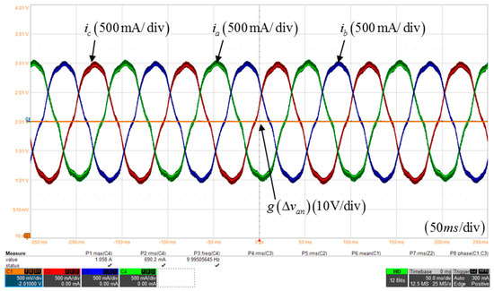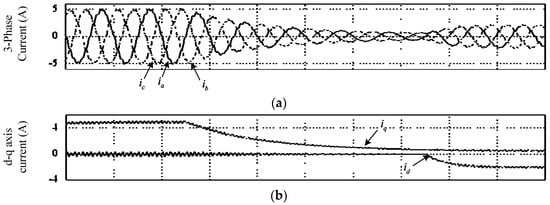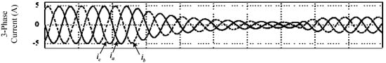 Figure 21 indicates the simulation result when any DTCS is not applied under the condition of Figure 20, comparing the performance of the proposed DTCS. Figure 21a is the three-phase currents and Figure 21b is the d-q axis current on the synchronous reference frame. It can be seen the amount of the current decreases, and the harmonic distortions of the current become smaller. This is caused by the fact that as the switch turn off delay is increased in the low current region. However, when is in the saturation region sufficiently, there is notable current distortions because the current controller cannot compensate the voltage distortion of high order harmonic distortions. As a result, the proposed DTCS applied three-phase currents has THD below 0.4%. In contrast, the three-phase currents which are not applied DTCS have a 5.4% THD that is about 10 times larger.
