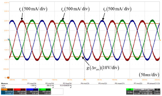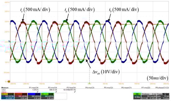 Figure 23, Figure 24 and Figure 25 show the three-phase currents waveforms and dead-time compensation pole voltage of the a-phase to compare the performance of the proposed DTCS. The three-phase current levels kept around 1.4% of the switch current rating to perform in the region where the effects of the switch parasitic are present. Figure 23 is the three-phase current waveforms without any DTCS, and it can be seen that serious current distortions occurs near the zero crossing and peak area. Figure 24 illustrates the three-phase current waveforms when a conventional DTCS considering only dead-time is adapted. While the compensation voltage amplitudes that does not reflect the variation of are larger than the actual voltage errors. Hence, it confirmed that the current distortion is due to the excessive compensation voltage. Figure 25 reveals the currents waveforms when the proposed DTCS was applied, which shows very ideal sinusoidal current waveforms even in the low current region where affected by variation.
