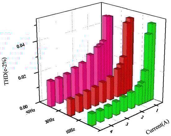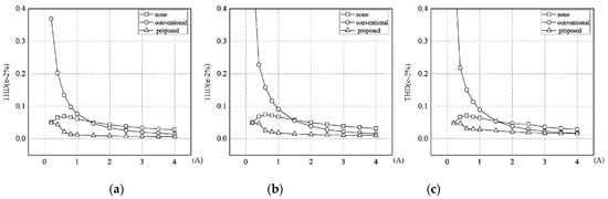Figure 31 shows the currents’ THDs at various inverter output conditions to compare the performance of the proposed DTCS. The currents’ THDs were compared with the magnitude of the peak current and the control frequency, and the THD of the a-phase current was extracted. In Figure 31, the square and circle symbols show the THD when the dead time compensation voltage is not applied and the THD when the compensation voltage considering only is applied as shown in Figure 23 and Figure 24, respectively. The triangle symbol is the THD when proposed DTCS is applied. The vertical axis denotes the THD value of the a-phase current and the horizontal axis denotes the peak values of the three-phase current.