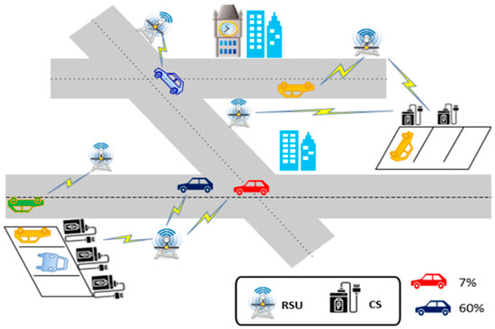 The architectural model of EV communication in smart cities incorporates wireless ad-hoc communication among EVs, CSs, and RSUs. Figure 2 is an illustrative example of V2I and V2G communication. Here, as EVs are going through the same geographical area, they can form a wireless ad-hoc network with RSUs and CSs based on a cell layout: that is, EVs, RSUs, and CSs within a one square kilometer radius.