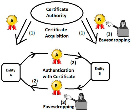 Certificate acquisition (1), authentication with certificates (2), and eavesdropping (3).