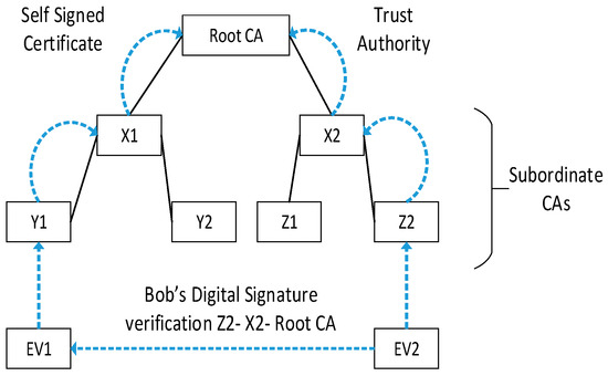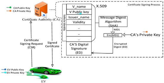 Figure 4 explains the process of certificate signing by a CA. The EV constructs a certificate request with all the credentials required by the X.509 format and sends it to CA. The CA has its pair of public and private keys. The private key is only known to CA, whereas the public key is known to everyone. The CA signs the credentials of the certificate request, as shown in Figure 4, with a message digest algorithm (MDA), and generates a message digest (MD1). The MD1 is a hash value which is further encrypted with CA’s private key to generate an encrypted digest (ED), also known as a signature. This process is called signing the certificate by CA. This paper uses the secure hash algorithm (SHA256) as the MDA and RSA for public key encryption. The signed certificates are loaded in tamper-free onboard units of EVs.
