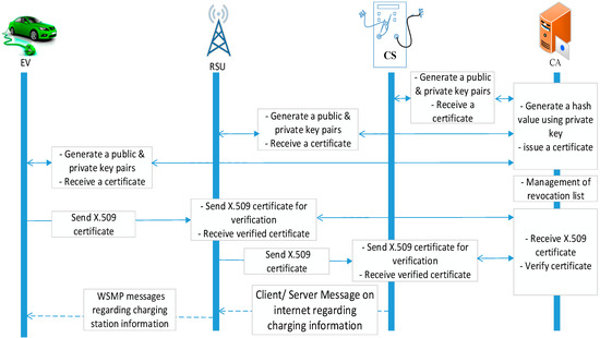 The authentication process through the explicit certificate mechanism between EV, RSU, and CS is shown in Figure 7. Initially EV, RSU, and CS receives their signed certificates from the CA. Next, the EV communicates with a nearby RSU to get charging station information. The RSU first verifies the received certificate through the CA. If the certificate is valid and not revoked, then communication is initiated. The charging station information is transmitted between the EV and the RSU through WSMP (wireless short message protocol) messages, as specified in Reference [7].