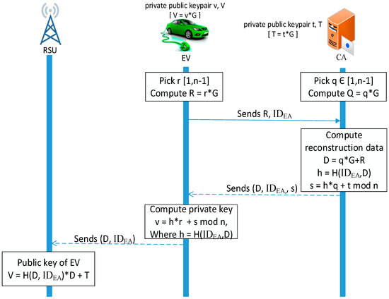 Another kind of certificate is the implicit certificate [32], which does not contain a user’s public key inside. The implicit certificate mechanism is a concept, and Elliptic Curve Qu-Vanstone (ECQV) is a mathematical incarnation of this concept [33]. An ECQV certificate contains a user’s identity and public key reconstruction data, along with the CA’s public key. When an RSU receives a certificate from an EV for establishment of communication, the RSU constructs the transmitter’s public key from the user identity, the CA’s public key, and the public parameter. The user’s public key is not explicitly contained in the implicit certificate. It is computationally infeasible for an intruder to compute a private key corresponding to an EV’s public key, or to construct a matching EV identity and reconstruct data for which a corresponding private key may also be computed [34].