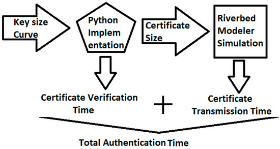In order to assess the suitability of these different mechanisms for VANETs, the total time lapse for authentication was calculated. The total authentication time is the combined time required for transmission of certificate from EV to RSU, and computational time to verify the certificate at the RSU. A combinational approach, depicted in Figure 9, was used. As shown, authentication mechanisms were implemented using Python OpenSSL library. Through these implementations two parameters were acquired. The first is the certificate size for each individual implementation, and the second is the computational time required to verify a certificate. These parameters are given in Table 2 and Table 3, third and fourth columns from the right.