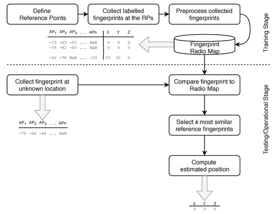 - Moreira, A.; Silva, I.; Meneses, F.; Nicolau, M.J.; Pendao, C.; Torres-Sospedra, J. Multiple simultaneous Wi-Fi measurements in fingerprinting indoor positioning. In Proceedings of the 2017 International Conference on Indoor Positioning and Indoor Navigation (IPIN), Sapporo, Japan, 18–21 September 2017; pp. 1–8. [Google Scholar]