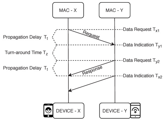 Generally, the time required for a signal to travel from one node to another is used to estimate the distance between the nodes. According to our proposed method, a device would request another device to exchange their position information, TOA of the same communication can be utilized to measure the distance between them. A brief process of two-way time of arrival is illustrated in Figure 3.