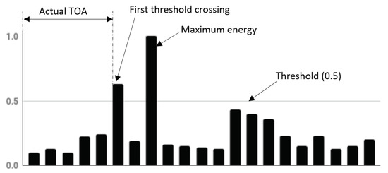 Here c is the speed of light. Akiyama et al. [49] proposed a method using a smartphone to measure the TOA, employ modulated light with a signal for the time-of-flight short measurement, they achieved positioning error of less than 10 mm. However, in an indoor environment, most connections between devices are NLOS as the LOS paths are blocked by wall, ceiling, or furniture. The LOS path is often mixed with multiple time-delayed NLOS paths. NLOS can degrade the D2D ranging since they have significant positive biases which make the measured pair-wise distances much larger than their actual values [50]. Some studies have focused on distinguishing NLOS connections from LOS connections. An identification technique based on maximum likelihood estimation is described in [51]. By exploring physical layer information 95% LOS was identified in [52]. Cui et al. [34] showed how to detected actual TOA from an NLOS / multipath channel from received signal energy. According to them in a multipath channel with a low signal to noise ratio, some low energy level value may appear before the maximum energy value. By setting a threshold value, actual TOA can be determined as shown in Figure 4.