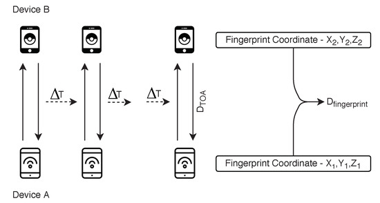 From their communication, device A would be able to calculate the physical distance between them by two procedures. Firstly, by signal’s time of arrival method () secondly, from their coordinate, that they received from eNB (). If these two values are the same or very close, then it can be supposed that the obtained position information from the fingerprinting method is correct as the outcome of the fingerprint positioning is verified by another method. This process can be repeated several times after a short time interval T.