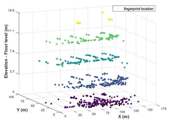In this research article, we have used the Wi-Fi crowdsourced fingerprint database created by a research group from Tampere University of Technology (TUT) [13]. The database and the benchmarking software are distributed under the open-source MIT license and can be found on the EU Zenodo repository [55]. The measurements were taken in a five-floor building in Tampere ( N, E), Finland. The five-floor building has a footprint of about 22,570 m (208 m × 108 m). Total 4648 fingerprints were collected which were then split uniformly randomly 15% for the training and 85% for the test purpose. Volunteer users installed the android application on their devices and reported the correct location (based on a manual input on the map) to the server. The server stored the location reported by the user, the time stamp, the device model, the MAC addresses of the heard access points and the RSS from each AP. A local coordinate system e.g., (x, y, z) = (123.45, 14.71, 0) was used instead of the global WGS84 commonly used in other applications. During the measurements, a total of 991 AP were heard, the exact position of the APs was not known. Figure 7 shows the fingerprint database.