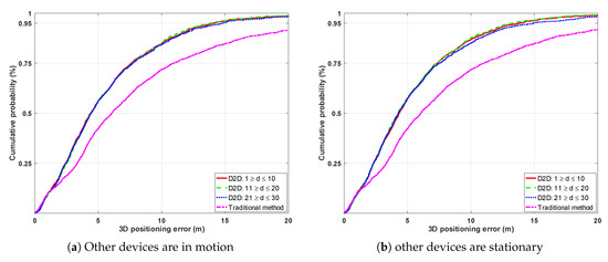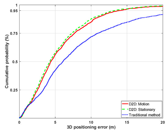 The results indicate that the proposed method provided better results if the other secondary devices are stationary, with a mean 3D error of 5.34 m. Nonetheless, our proposed method also provides good results, with a 5.59 m mean positioning accuracy, when the primary device exchanges information with devices which are in motion. It is worth to highlight that the proposed method prevents very large positioning errors. With the traditional method, almost 10% of operational samples have a positioning error higher than 20 m, whereas the presence of such kind of errors is marginal when D2D communications are considered.