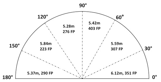 In an open space, it is highly likely that during the movement a user changes her/his direction. Since the motion did not affect the positioning accuracy in the previous experiment, it indicates that the moving direction might not have a significant effect on the proposed method. Effect of the change of direction has been investigated in this experiment. Since different test fingerprint has different position and orientation, it is impractical to maintain common axis reference for angle calculation. However, since the database contains local coordinate, we used the origin point ( = [0, 0]), UE coordinate, and other devices coordinate to make a triangle and calculate the angle of motion. In Figure 10 it can be seen that 351 test fingerprint (FP) took assistance from such devices which changed their course between 0 to 30 angular direction resulted in a mean 6.12 m error.