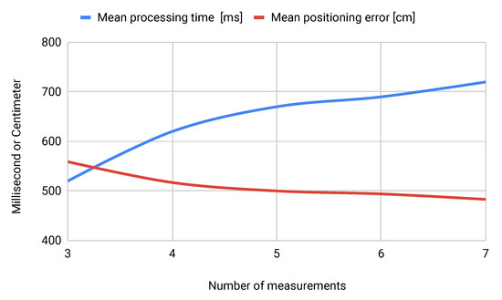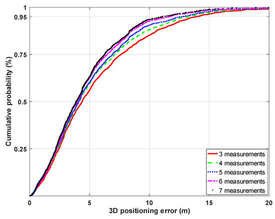 From Figure 11 it can be seen that four and five times measurement provides better accuracy than that of baseline three times measurement. Six and seven times measurement between UE and other devices provide even better accuracy. However, the computational load increases as the number of considered references are included. There should be a trade-off between positioning accuracy and the number of measurement to keep the calculation complexity and energy consumption as low as possible.