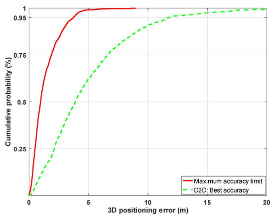 All the experiments in this paper were carried out over a public dataset which was collected by means of crowdsourcing. In contrast to professional deployments with a dense radio map (small grid and many training fingerprints), the density of training fingerprints in the selected database was not so high only 0.03 fingerprints/m. This low density might have contributed to degrading the positioning accuracy. An additional experiment was carried out to compare the accuracy of the proposed D2D method (best case) with respect to the maximum possible accuracy for the database. This maximum accuracy is computed as the physical distance of the test fingerprint location with respect the nearest training fingerprint’s location in the real-world (not RSS-space). Figure 13 shows the comparison between the maximum accuracy limit of the database and the best-achieved accuracy through the proposed method.
