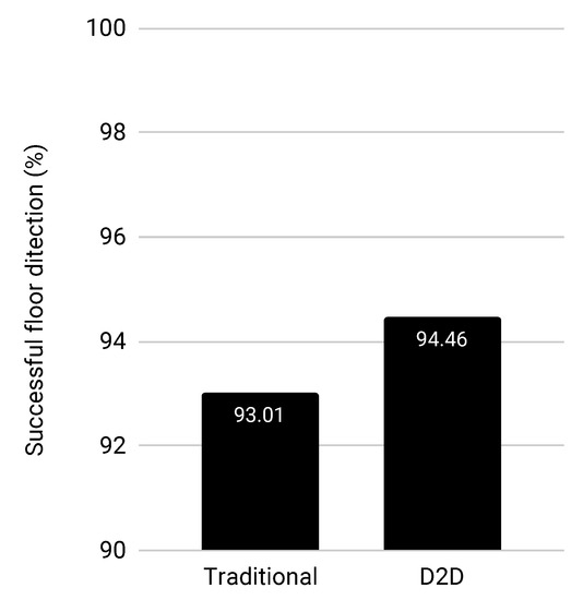 Finally, we checked the successful floor detection rate. In Figure 14 it can be seen compare to the traditional method, our proposed method shows slightly better correct floor detection rate with . Although the absolute increase of performance (as successful floor detection rate) has been just with respect to the traditional method, the relative floor detection error has been reduced in a (from to ). While all the benchmark results for correct floor detection rate were in between to in the previous study [13].