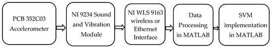 The accelerometer (PCB 352C03) is a single-axis accelerometer hence only one-dimension data is considered for this process. Although multi-axis accelerometer can also be used, it will lead to large feature set hence longer computation time. In order for the vibration data to be analyzed, data has to be acquired, this is achieved using a NI Sound and Vibration input module (NI 9234) in conjunction with a wireless and ethernet carrier (NI WLS 9163). NI WLS 9163 is a wireless or ethernet interface for an I/O module. Here we have used the Ethernet port for connectivity. Using NIMAX, the acquisition setup has been configured for later use in MATLAB’s data acquisition module. MATLAB’s data acquisition module is used to acquire the data into MATLAB for further processing. The SVM algorithm is implemented using MATLAB built-in classifier libraries. The workflow is shown in Figure 6.