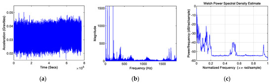 Comparing time-domain vibration data with frequency domain. (a) Time domain vibration data; (b) fast Fourier transform (FFT, magnitude) of vibration data; (c) power spectral density (PSD) of vibration data.