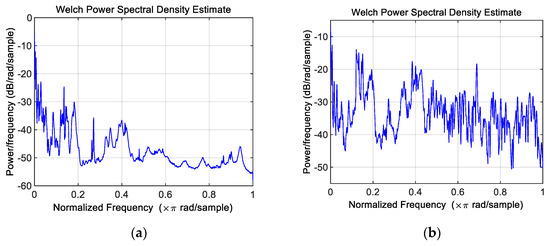 Comparison of normal and faulty data. (a) Normal PSD Hanning window (length 2048); (b) faulty PSD data Hanning window (length 2048).