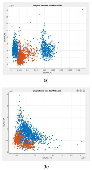 Once the data is processed as required, it can be used for the classification by selecting the features from the computed PSD data. Here, the features are chosen such that the pattern of variation of vibration data from one sampling time makes up the entire feature space. This will be similar to a pattern classification in an image-processing application. In choosing this method, only the vibration associated with faults consisting of a different pattern to that of normal vibration data will be classified as faulty. Since the features will be around 2000, data sets for training were chosen to be around 4000 to get a more accurate model. Figure 9 shows scatter plots of some columns of the feature set. The blue points indicate normal data and red points indicate faulty data. It can be seen from these plots that the faulty data is distinguishable. By combining many such features, a training model is obtained.