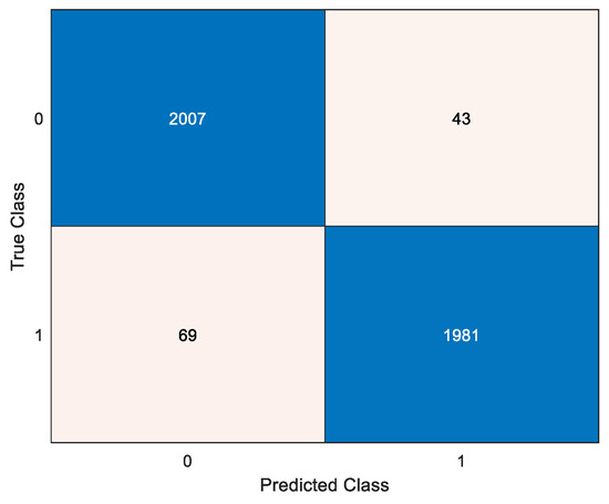 Implementing the SVM in MATLAB, a trained model is obtained with the feature set, as mentioned earlier. The label vector consists of ones for normal data and zeroes for faulty data. By modifying the parameters such as the type of kernel and cross-validation folds, various results were obtained for comparison. The best possible model with the most accuracy was selected for further prediction. A test data set was used for prediction, which gives a prediction vector consisting of predicted class labels associated with the test data. By comparing the predicted class labels with the class labels of test data, a confusion matrix can be created as shown in Figure 10. After computing the confusion matrix of the obtained results, the accuracy was found to be 97%. This implies that when a data set is classified as either faulty or not faulty, then 97% of the time it is correctly classified.