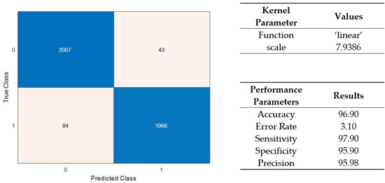 Confusion matrix and performance results for a linear support vector machine (SVM).